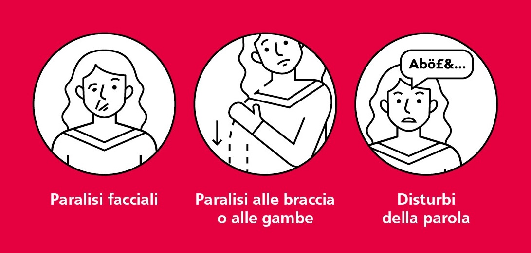 - paralisi del viso: paralisi improvvisa, disturbi della sensibilità o debolezza, per lo più solo a un lato del corpo;